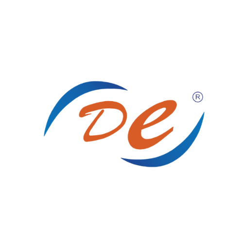 Logo “De” được thiết kế mềm mại, trẻ trung với điểm nhấn là chữ “De” màu cam nằm giữa hai đường uốn lượn màu xanh dương: